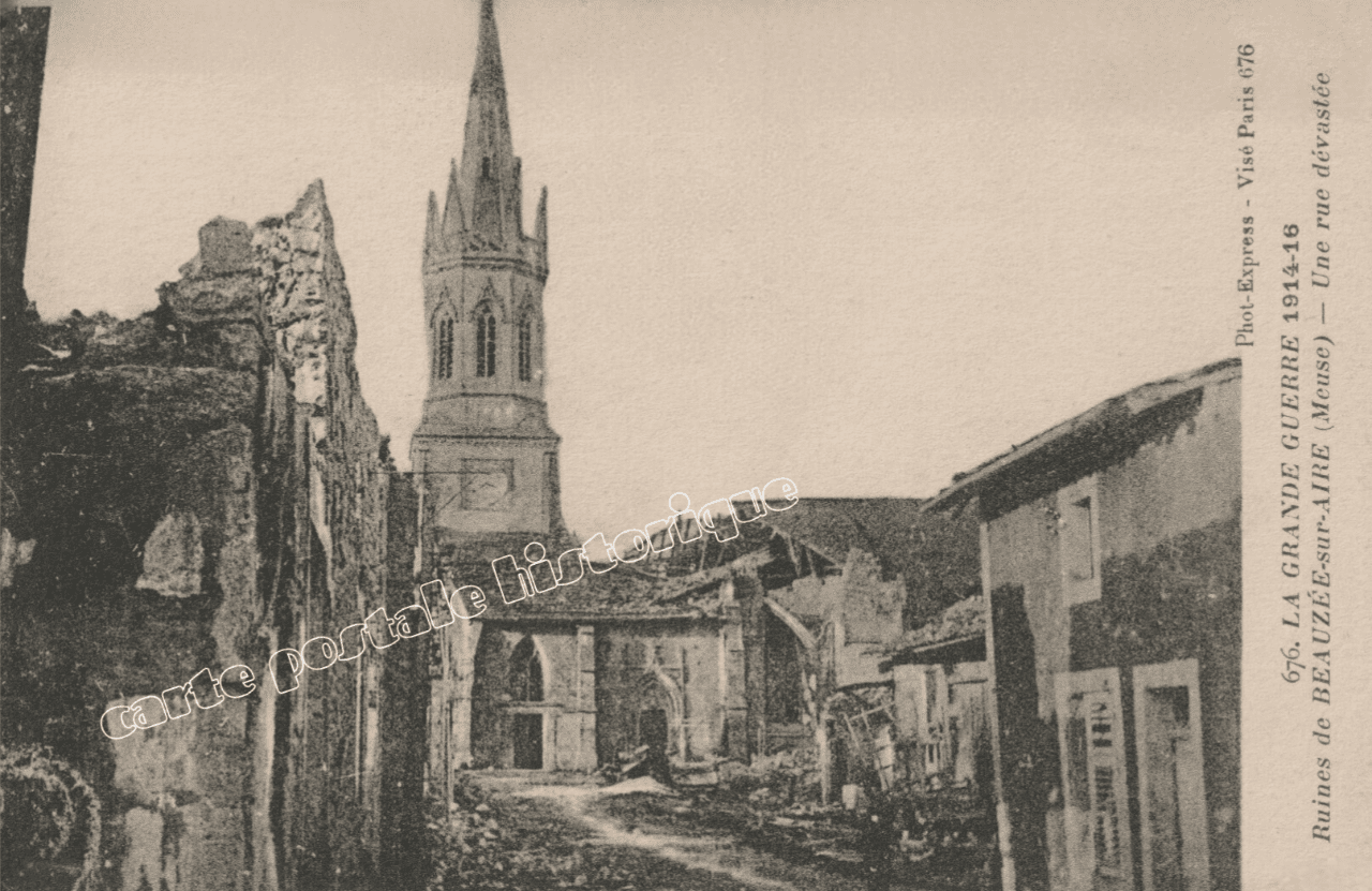 Véritable document historique, cette carte postale de guerre met en lumière la violence des combats et l’impact durable du conflit sur les communes rurales françaises situées à proximité du front. Beauzée-sur-Aire fait partie de ces villages meurtris dont l’architecture, la vie quotidienne et le paysage ont été profondément marqués par les événements de 1914-1918.