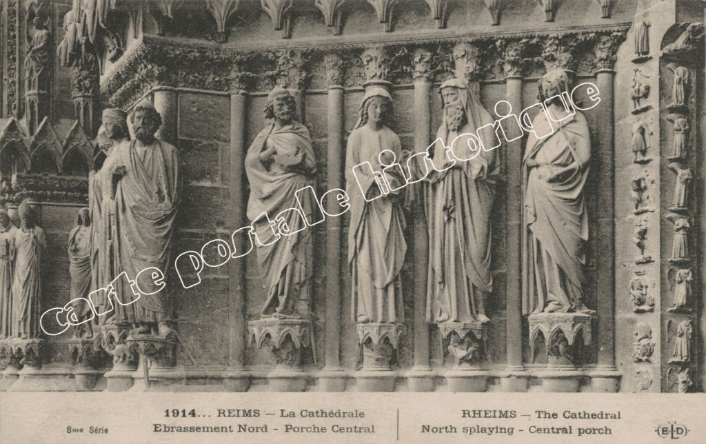 En 1915, le porche central de la cathédrale Notre-Dame de Reims porte encore les stigmates des terribles destructions subies lors de la Première Guerre mondiale. Dès septembre 1914, la cathédrale est lourdement touchée par les bombardements allemands. Les obus provoquent un incendie majeur qui détruit la toiture recouverte de plomb ; le métal en fusion se déverse alors sur la façade occidentale, endommageant gravement les sculptures et les portails, notamment le porche central.