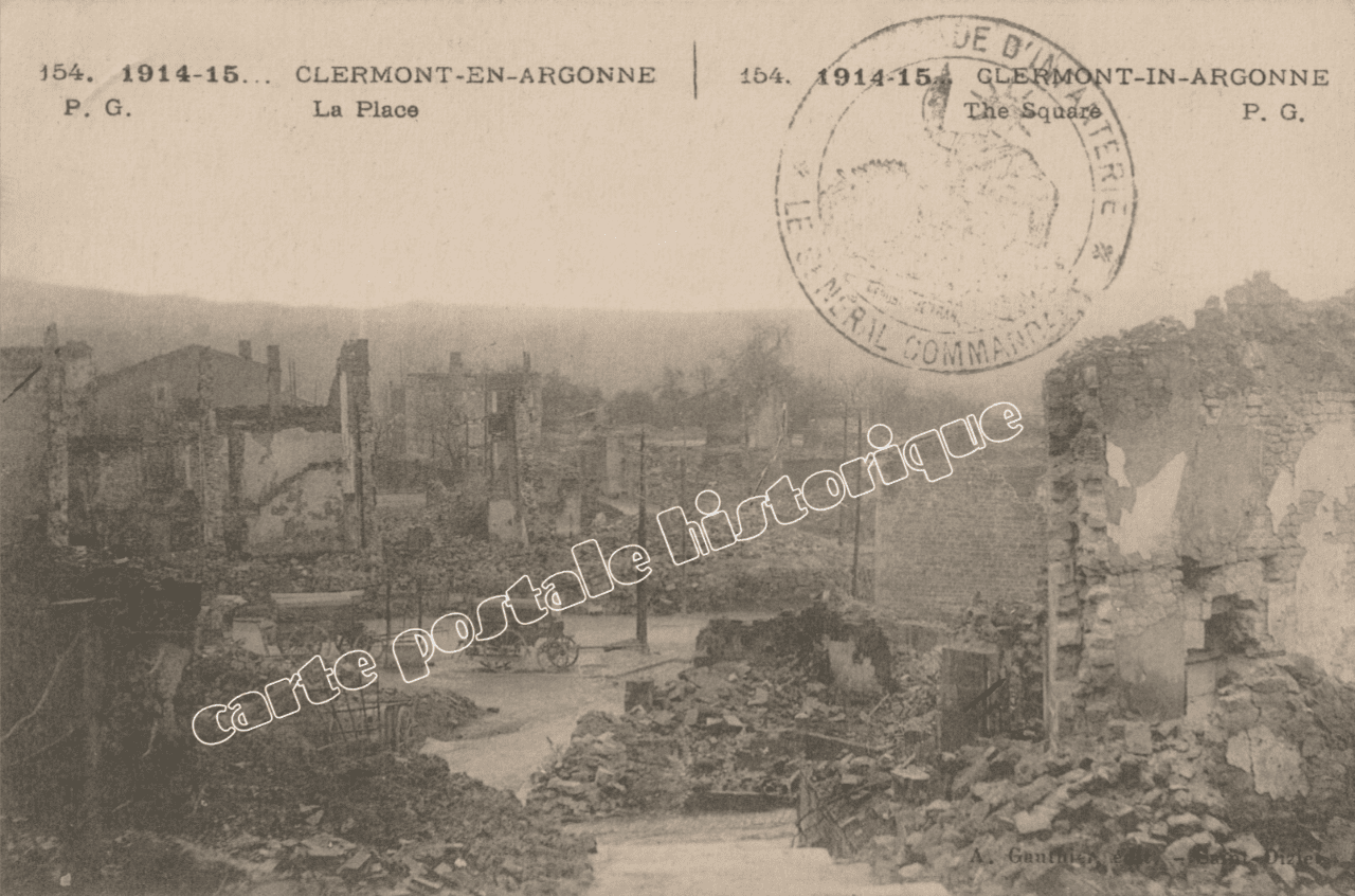 Carte postale ancienne de la place de Clermont-en-Argonne en 1915