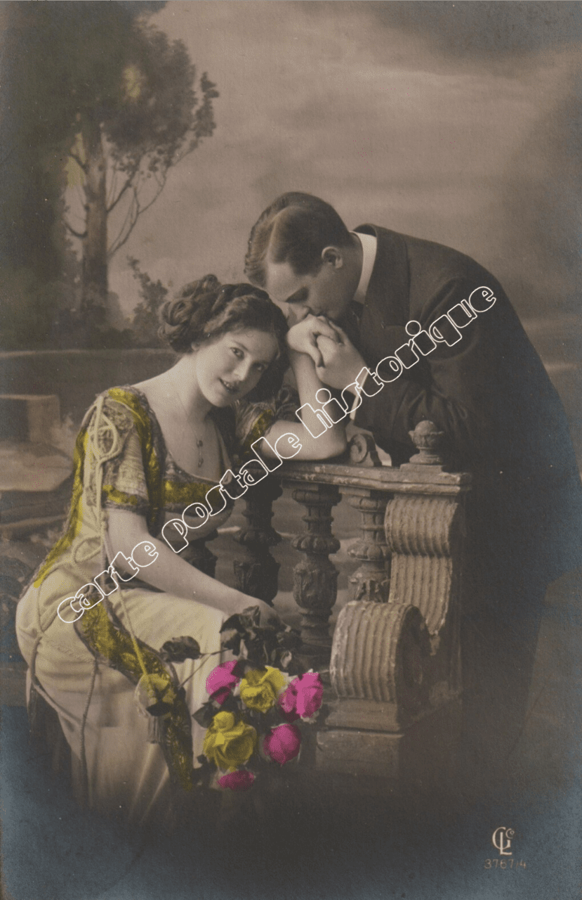 Découvrez cette authentique carte postale ancienne “Couple au bouquet de roses” datée de 1912, un témoignage émouvant de la vie sentimentale et sociale de la Belle Époque. Cette carte illustre un couple élégant posant avec un bouquet de roses, symbolisant l’amour, l’élégance et les codes sociaux de l’époque.