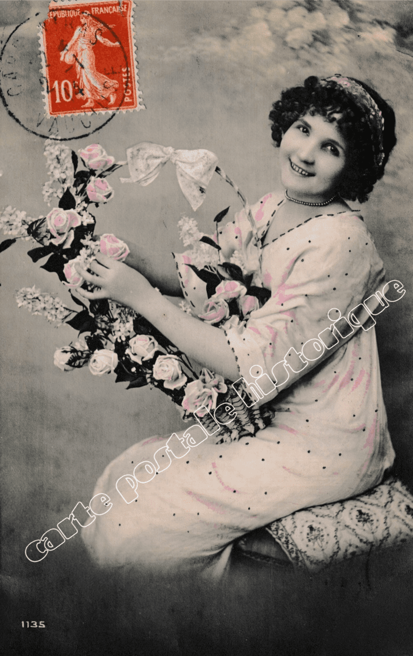 Découvrez cette authentique carte postale ancienne représentant une femme à la corbeille de fleurs en 1914, scène emblématique de la vie quotidienne au début du XXᵉ siècle. Cette image met en valeur une figure féminine portant une corbeille garnie de fleurs, symbole à la fois de travail, de nature et de traditions populaires à la veille de la Première Guerre mondiale.