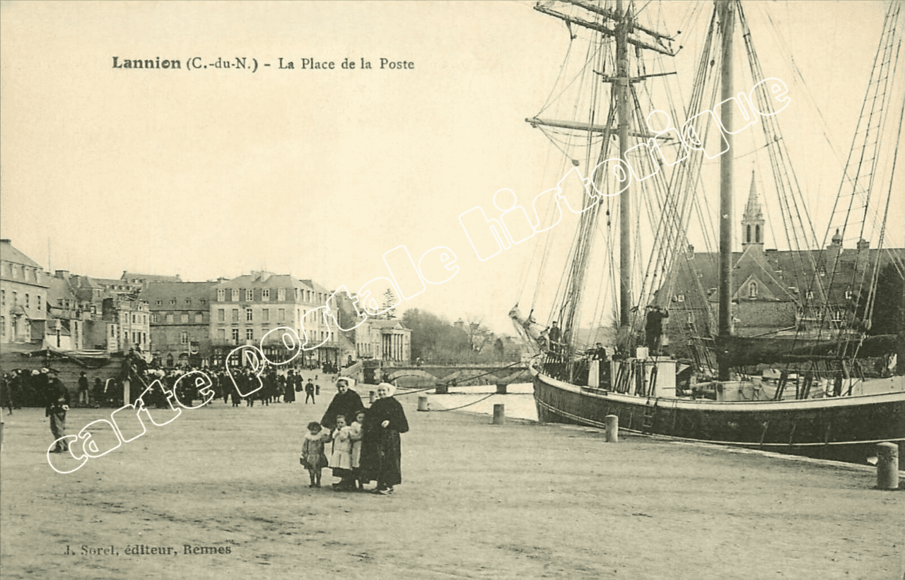 Découvrez cette carte postale ancienne représentant la place de la Poste à Lannion, cœur de la vie urbaine de la ville au début du XXᵉ siècle. Cette vue met en lumière l’architecture caractéristique de Lannion, l’animation de la place et le rôle central de la poste dans la vie quotidienne locale.
