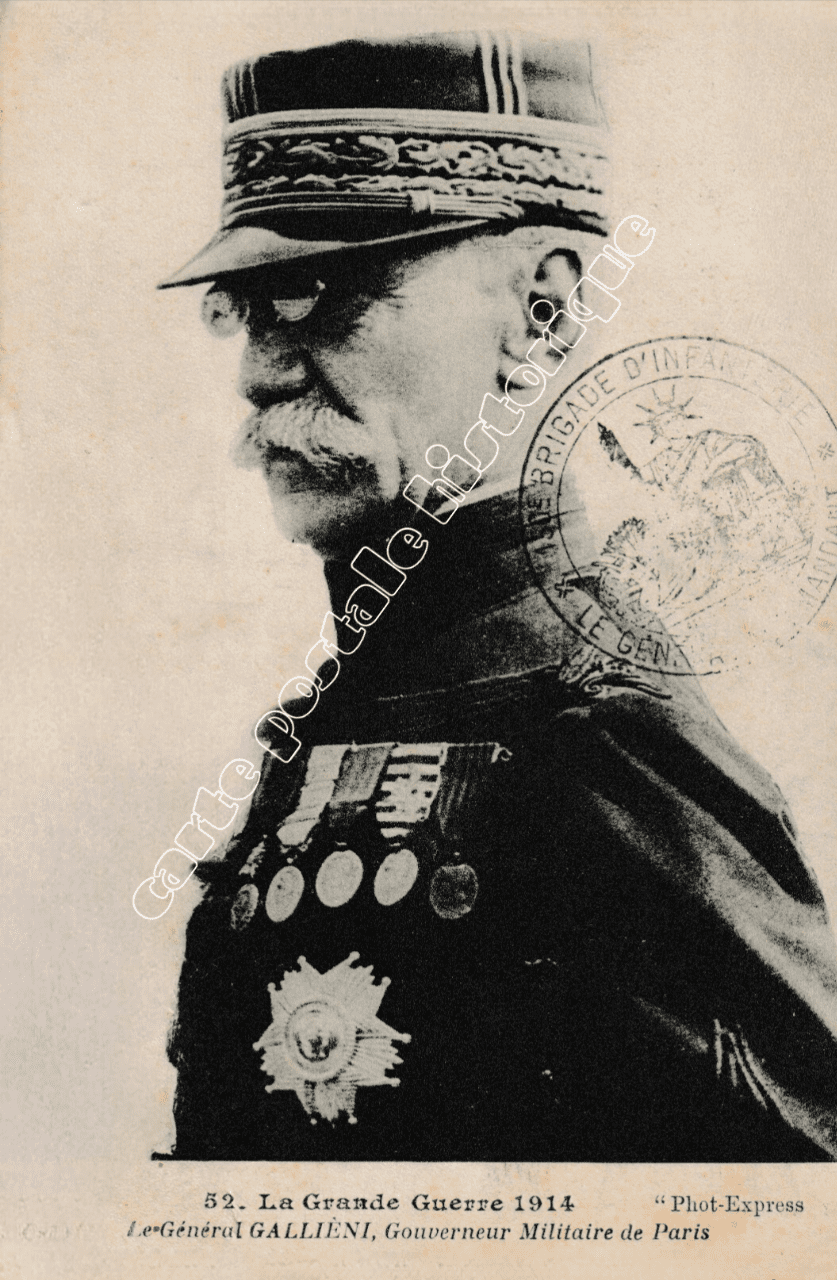 Découvrez cette authentique carte postale ancienne représentant le Général Joseph Gallieni en 1914, figure majeure de l’histoire militaire française au début de la Première Guerre mondiale. Ce portrait historique rend hommage à l’un des grands stratèges de l’armée française, connu notamment pour son rôle décisif dans la défense de Paris lors de la bataille de la Marne.