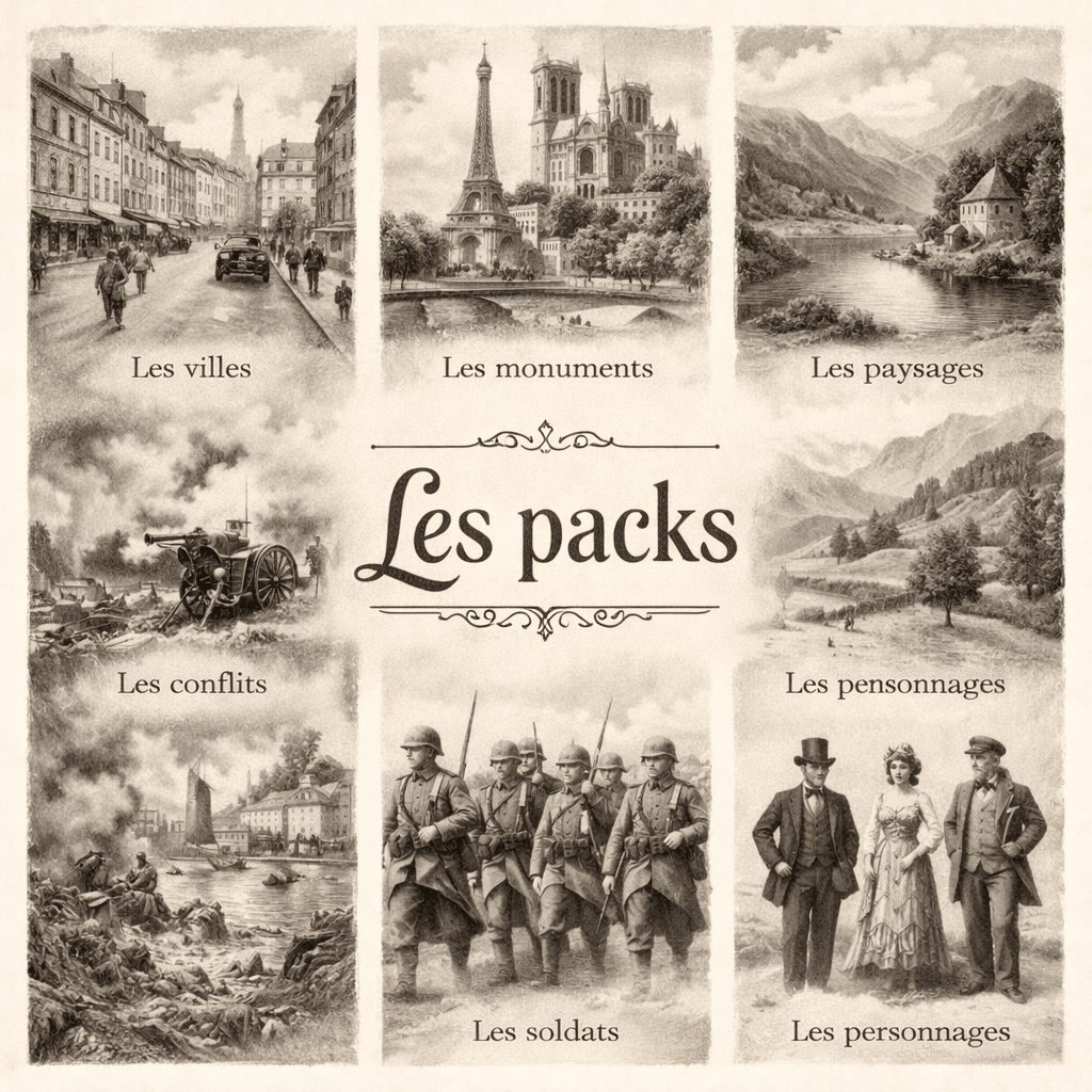 Que vous soyez intéressé par les villes historiques, les villages pittoresques, les monuments emblématiques, la vie quotidienne d’autrefois ou les scènes de guerre et patrimoine, nos packs offrent une expérience complète et immersive.