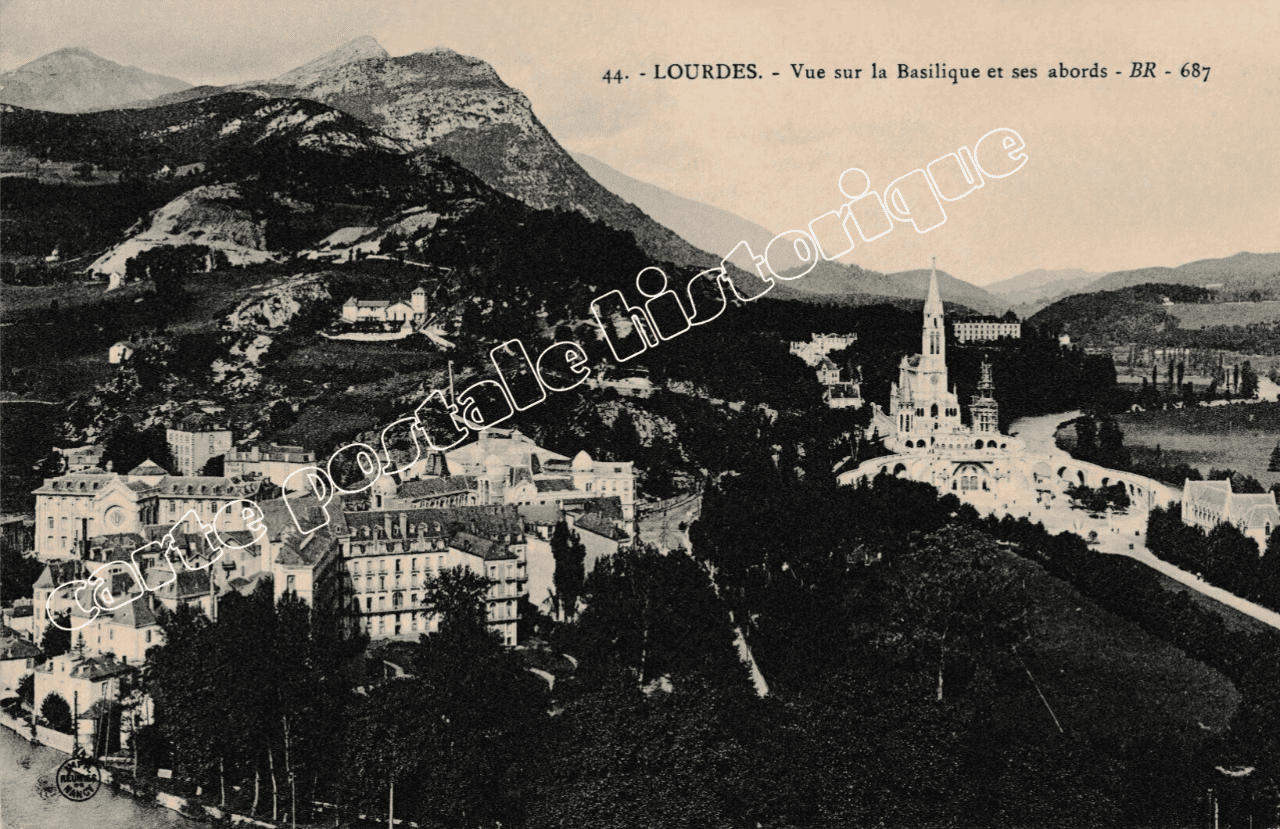 Cette carte postale ancienne offre une vue remarquable sur la Basilique de Lourdes et ses alentours en 1916. Elle témoigne de l’importance spirituelle et architecturale du site au début du XXᵉ siècle, en pleine période de la Première Guerre mondiale.