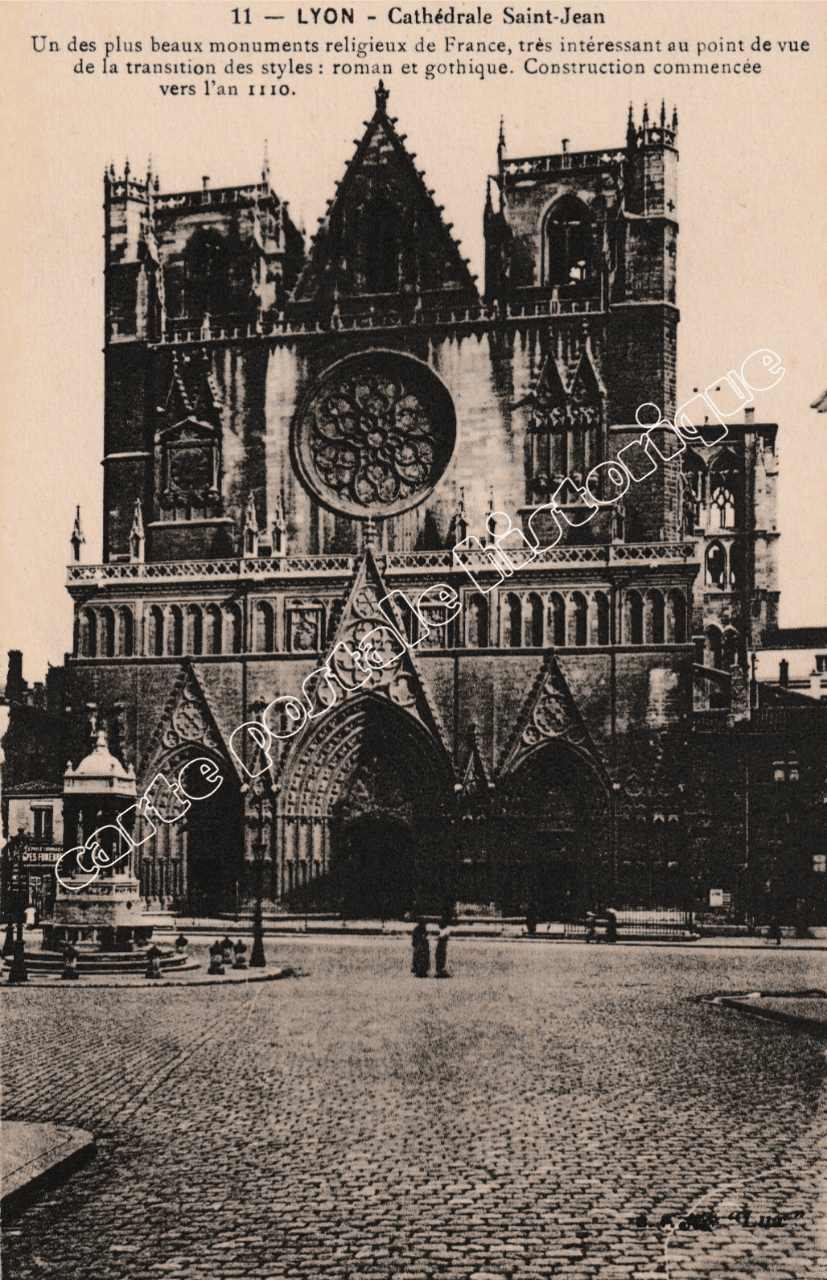 Découvrez cette authentique carte postale ancienne de Lyon – Cathédrale Saint-Jean, représentant l’un des monuments religieux les plus emblématiques de la ville. Située au cœur du Vieux Lyon, la cathédrale Saint-Jean-Baptiste est un chef-d’œuvre de l’architecture gothique et romane, symbole du patrimoine historique et spirituel lyonnais.