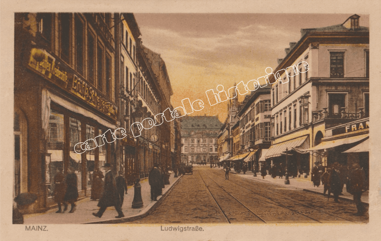 La Ludwigstrasse, axe central de la ville, apparaît ici comme un lieu de passage et d’échanges, symbole du renouveau économique et social de Mayence après les bouleversements du conflit. Cette carte postale historique permet d’observer l’évolution du paysage urbain, les modes de déplacement et l’atmosphère de la ville dans les années 1920.