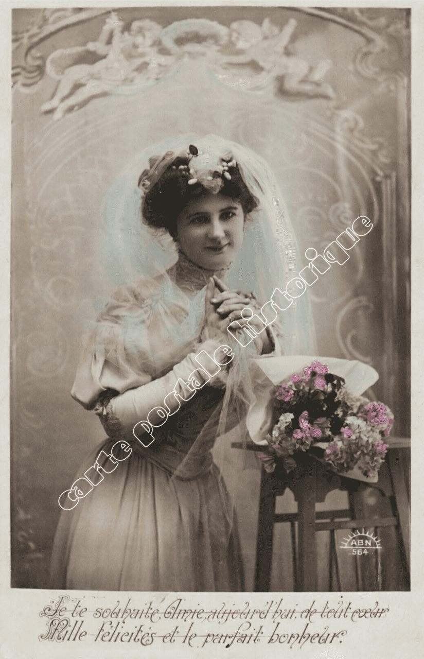 Découvrez cette authentique carte postale ancienne “Message – La mariée” datée de 1912, représentant une scène typique de mariage au début du XXᵉ siècle. La carte capture l’élégance et le raffinement des costumes nuptiaux de l’époque, ainsi que l’atmosphère des célébrations traditionnelles.