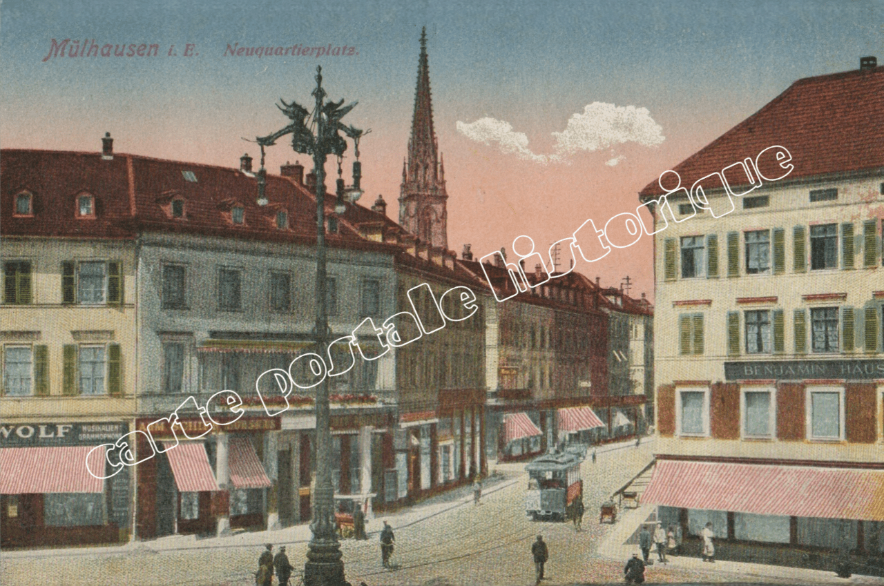 Cette carte postale ancienne représente le quartier de la Nouvelle Place à Mulhouse en 1918, offrant un témoignage précieux de l’urbanisme et de la vie quotidienne dans une ville alsacienne à la fin de la Première Guerre mondiale. Les bâtiments, l’organisation de la place et l’animation de la rue reflètent l’évolution architecturale et sociale de Mulhouse au début du XXᵉ siècle.