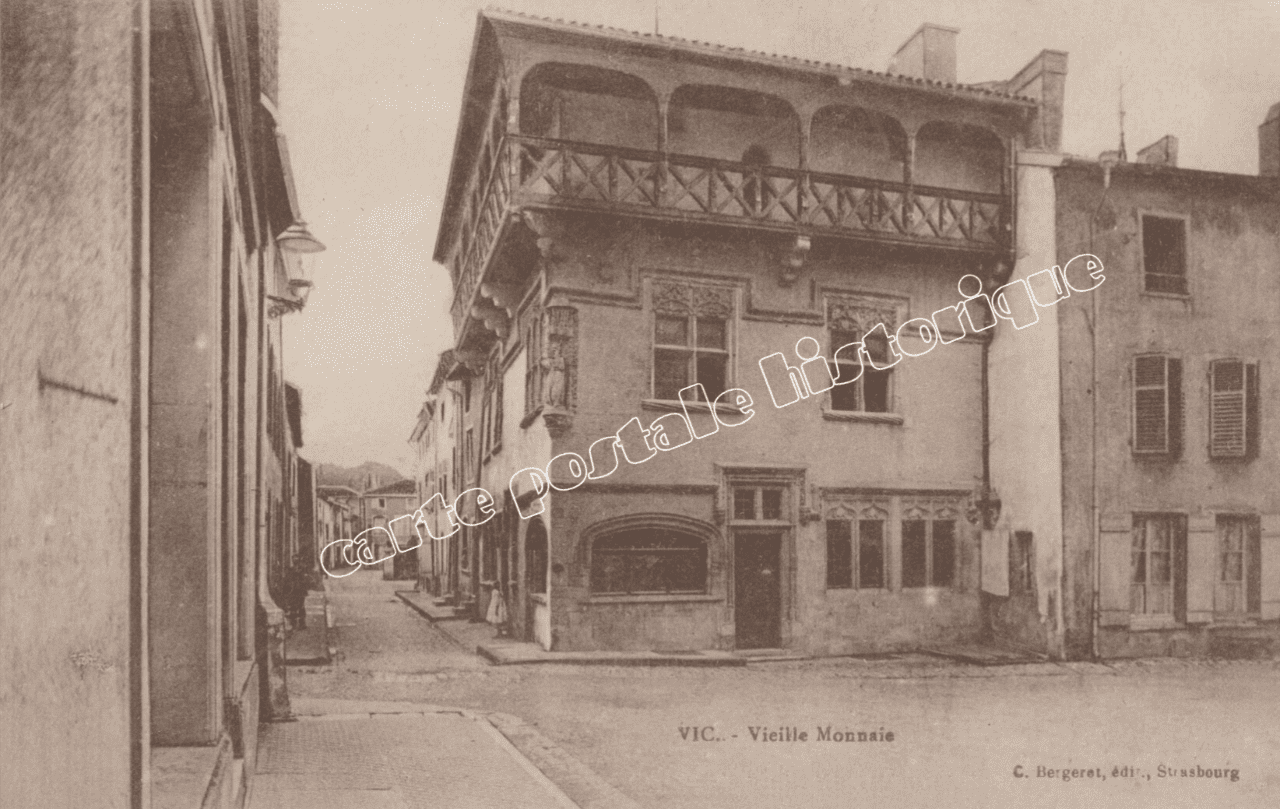 Découvrez cette authentique carte postale ancienne de Vic – Vieille Monnaie (1919), représentant un quartier historique emblématique de la ville juste après la Première Guerre mondiale. Cette vue ancienne met en valeur l’architecture traditionnelle, les façades anciennes et l’atmosphère caractéristique des centres urbains français du début du XXᵉ siècle.